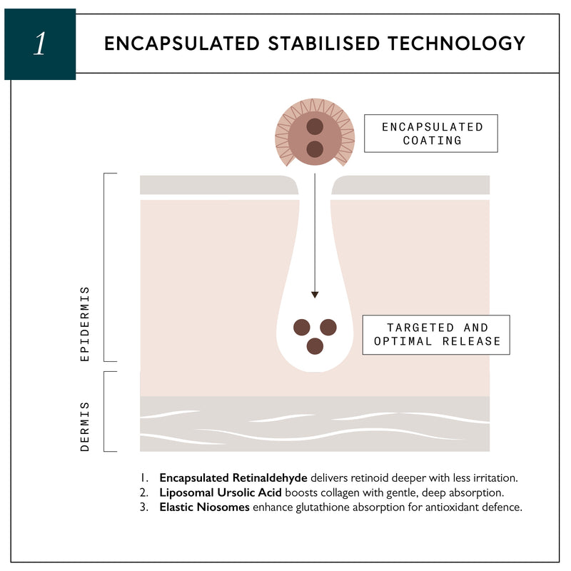 Powerful proprietary blend of Encapsulated Retinaldehyde, Liposomal Ursolic Acid, and a restorative Tripeptide, work to help boost regeneration, collagen, and elastin, whilst targeting dark spots, breakouts, and hyperpigmentation.
