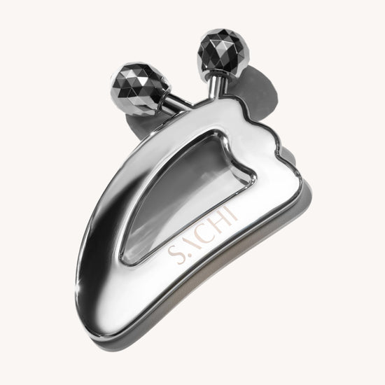 Titanium alloy in a silver finish with a contoured gua sha edge and twin rolling massage balls. An ergonomic handle provides precise control; faceted rollers deliver multi-angle stimulation; smooth, polished edges glide gently on skin. Naturally cool, durable, and easy to clean. Size: 7.4 × 11.9 cm.