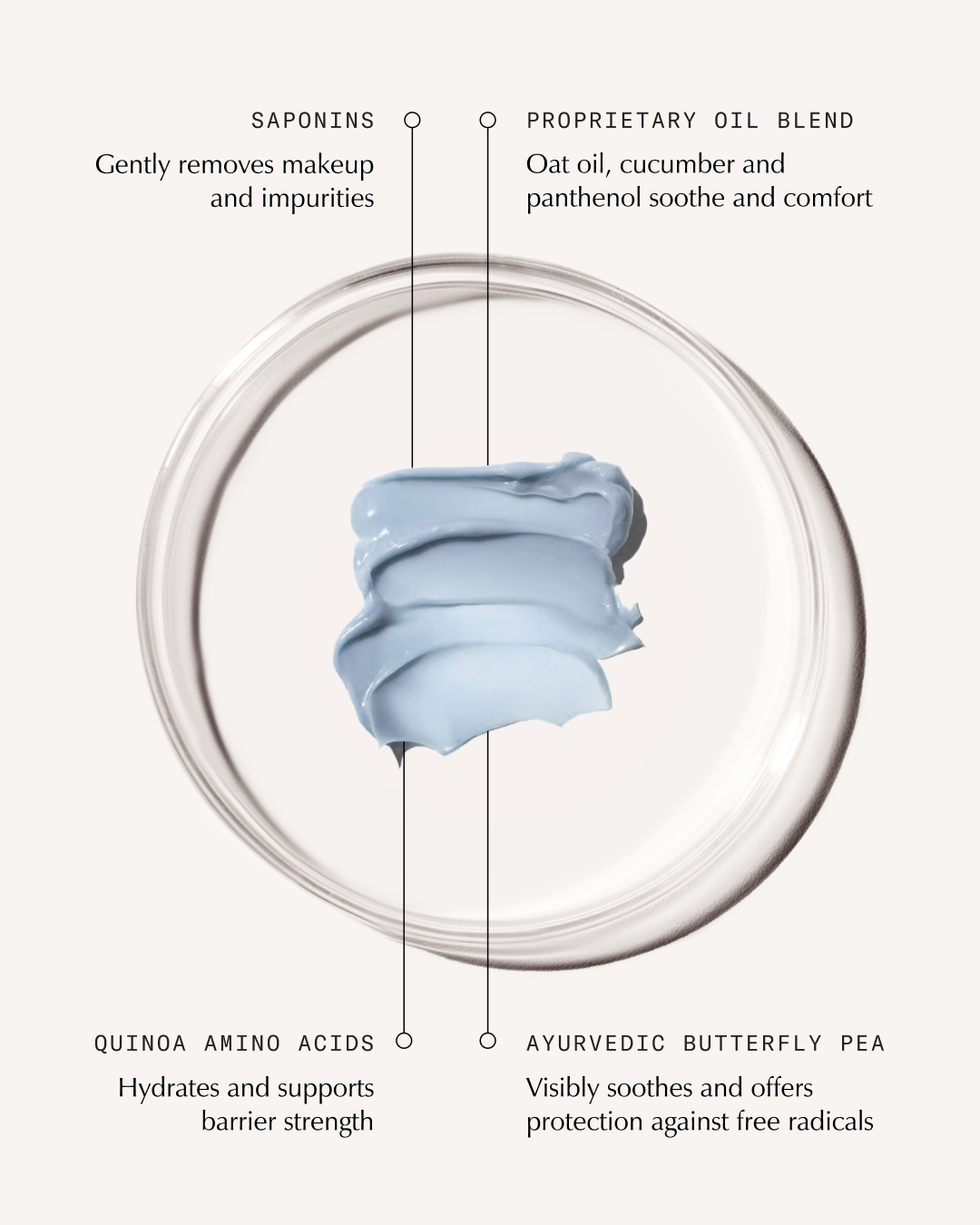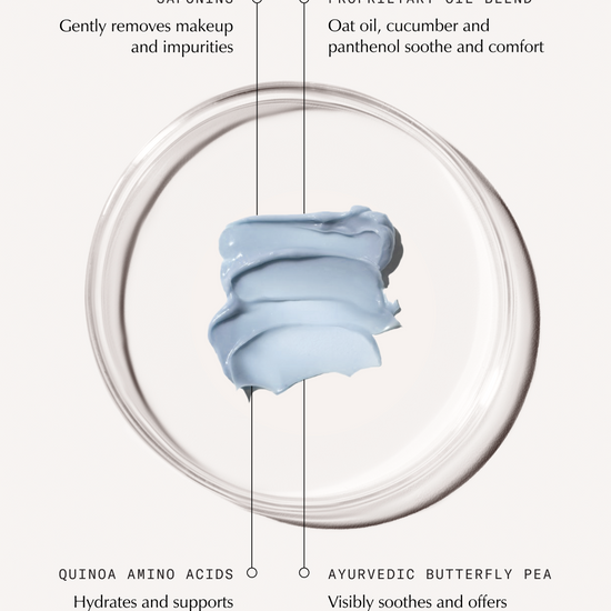 Clinically proven to calm, hydrate, and soften skin in just 4 weeks.* The Ayurvedic plant-based surfactant, Saponins, gently removes makeup, foundation, mascara and impurities, whilst comforting and replenishing the skin.