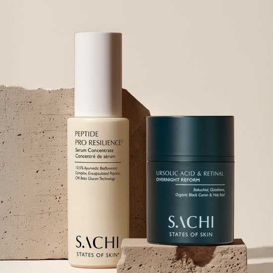 Harnessing a powerful proprietary blend of encapsulated Retinaldehyde, patented Liposomal Ursolic Acid, a restorative Tripeptide, and a 10.5% Ayurvedic Bioflavonoid Repair Complex with peptides, this advanced duo helps reinforce the skin’s natural recovery process. Enriched with an Ayurvedic botanical blend and twelve potent antioxidants, it helps improve the appearance of fine lines, uneven